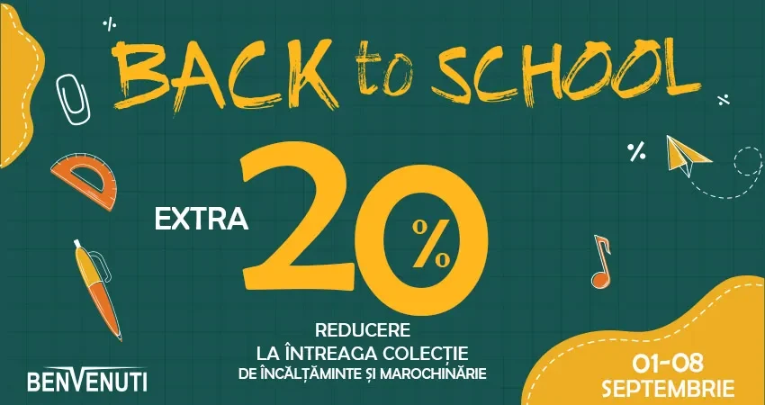 În perioada 01–08 septembrie 2025, Benvenuti lansează o campanie dedicată revenirii la școală, oferind extra 20% reducere la întreaga colecție de încălțăminte și marochinărie. Astfel, elevii și profesorii se vor putea bucura de pantofi și accesorii noi, pentru începutul de an școlar.